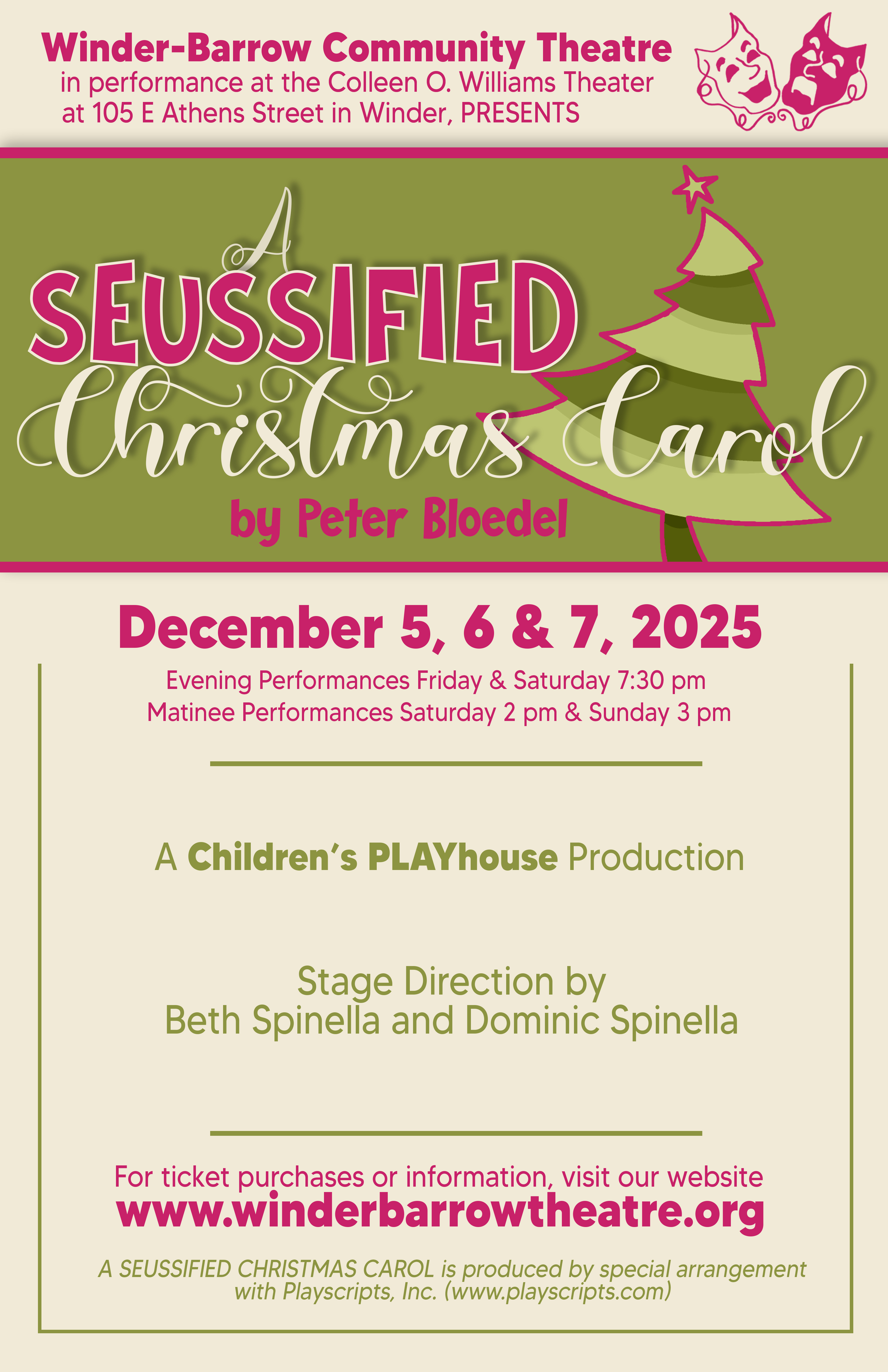 Auditions for "A Seussified Christmas Carol" will be held on Saturday, September 20th at 10 am in the theater of the Winder Cultural Arts Center at 105 E. Athens Street in Winder. Please bring a current photo and your calendar so you can note any dates you have a conflict. Rehearsals will be Monday, Tuesday, and Thursday nights during October and November until Tech week. This will be a cold reading from the script.